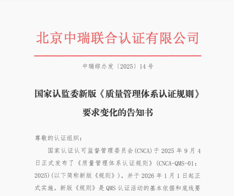 尊敬的认证组织:国家认证认可监督管理委员会(CNCA)于2025年9月4 日正式发布了《质量管理体系认证规则》(CNCA-QMS-01:2025)(以下简称新版《规则》),并于2026年1月1日起正式实施。新版《规则》是QMS认证活动的基本依据和底线要求,也是地方认证监管部门对获证企业及认证…
