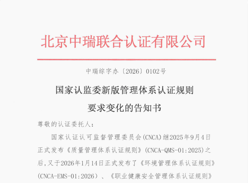 尊敬的认证委托人:国家认证认可监督管理委员会(CNCA)继2025年9月4日正式发布《质量管理体系认证规则》(CNCA-QMS-01:2025)之后,又于2026年1月14日正式发布了《环境管理体系认证规则》(CNCA-EMS-01:2026)、《职业健康安全管理体系认证规则》(CNCA-OHSMS-01:2026),并将于2026…
